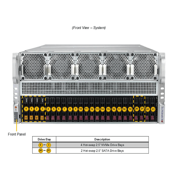- Dual front hot-swap 2.5" SATA + 4 front hot-swap 2.5" NVMe drive bays